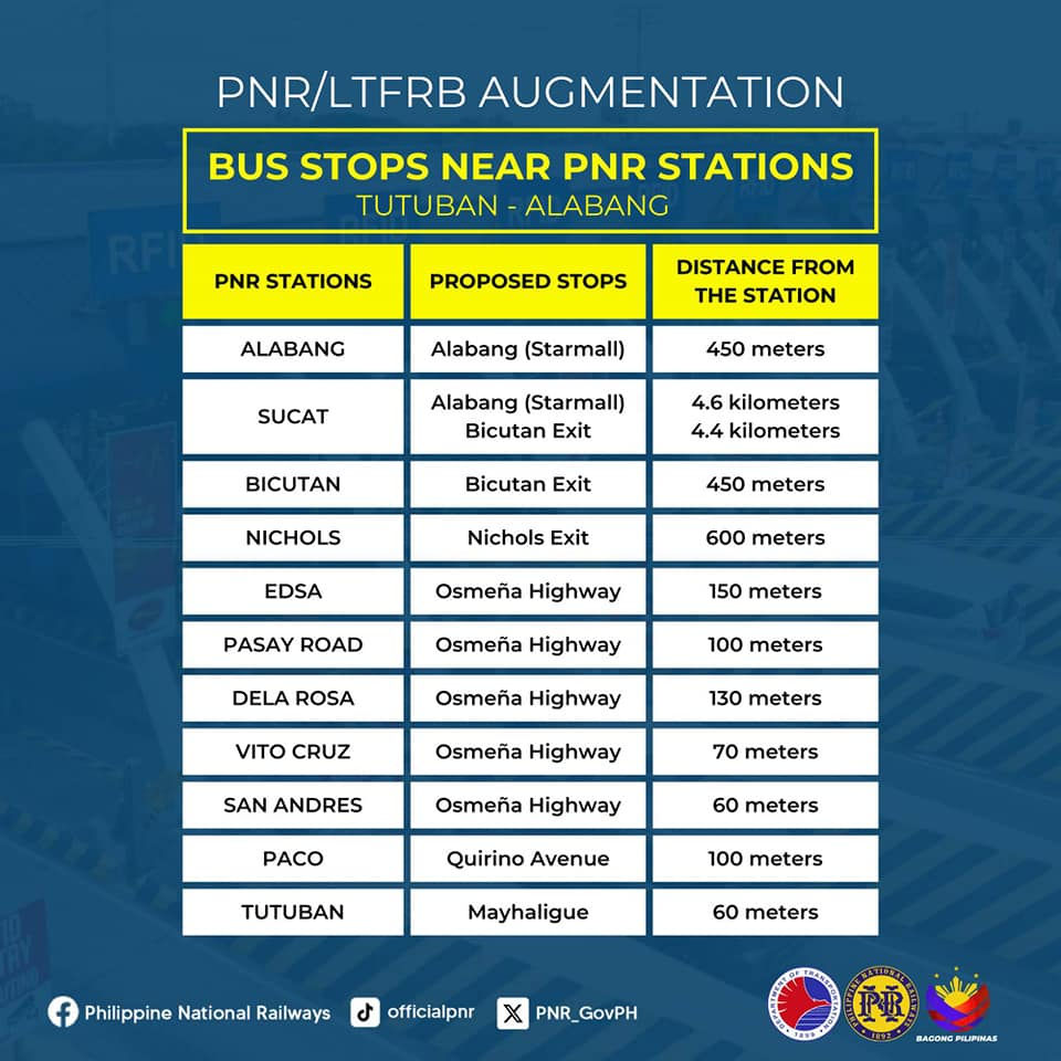 In a Facebook post, the DOTr said buses travelling from Tutuban to Alabang and vice versa are expected to drop off and pick up passengers near existing PNR stations.